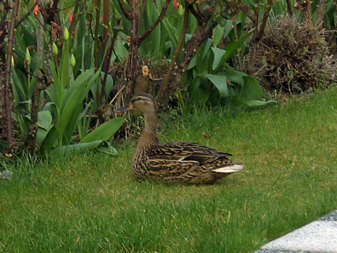 Heute war bei uns ein Stockenten-Paar und suchte offenbar einen guten Platz für ein Nest. Da wir kein Swimming-Pool haben, fühlten wir uns in keiner Weise zuständig und betrachteten das als einen netten Zufall. Das war auch der Grund, warum ich sofort die Kamera schnappte und ein Foto versuchte, in der Gewißheit, so schnell nicht wieder eine Ente vor die Linse zu bekommen.